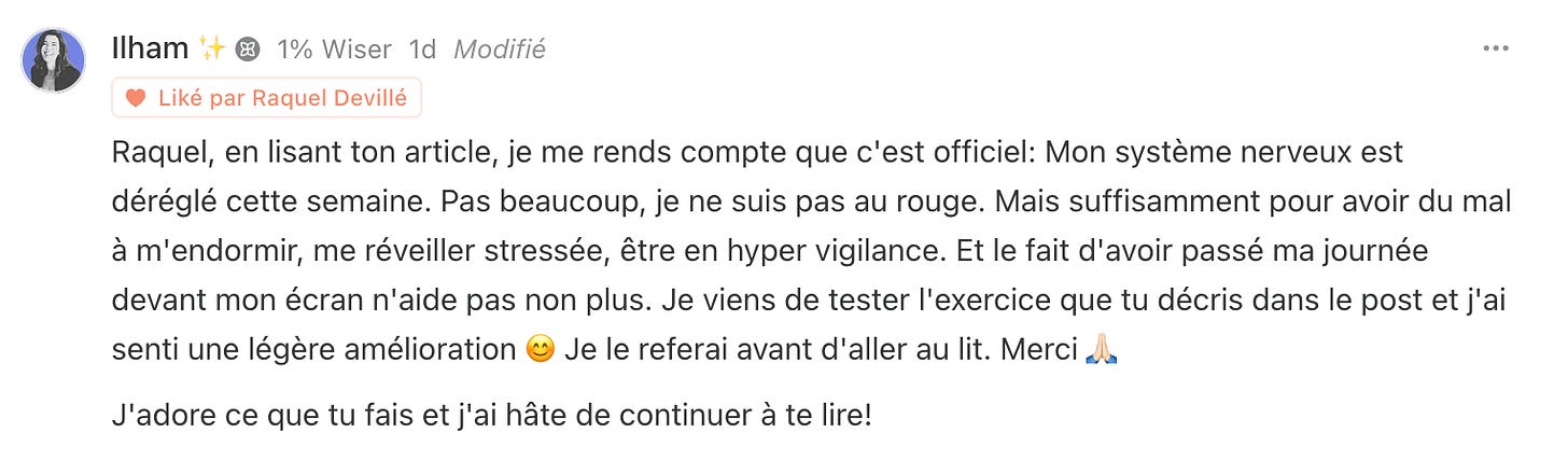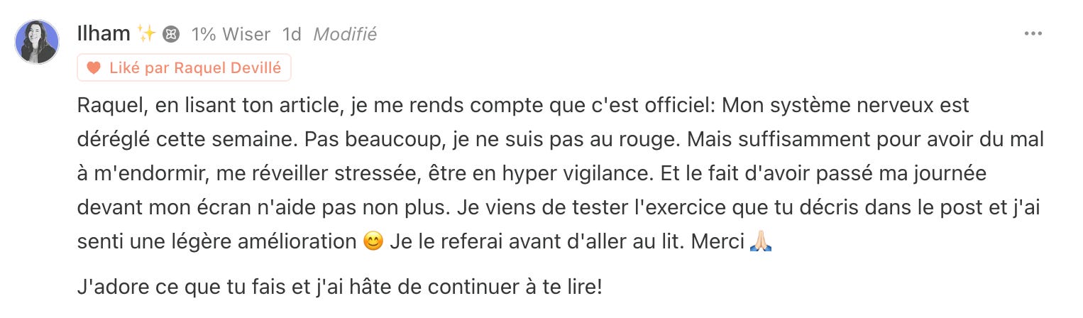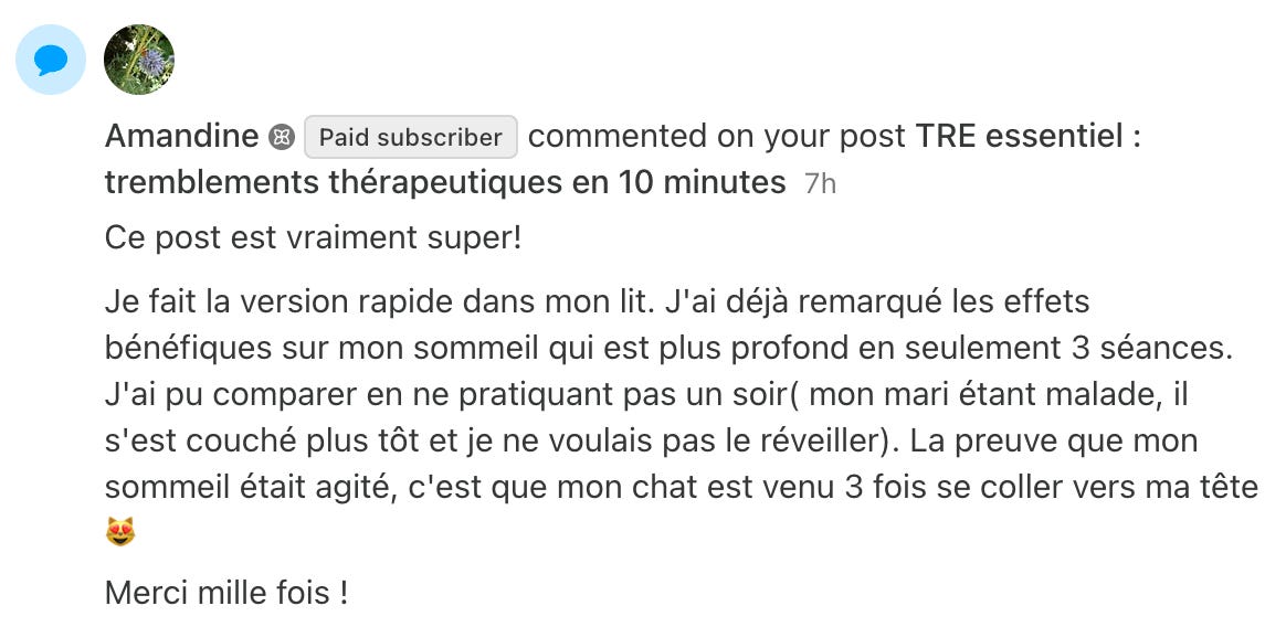 “Mon système nerveux est déréglé cette semaine. Je viens de tester l’exercice que tu décris dans le post et j’ai senti une légère amélioration. Je le referai avant d’aller au lit. Merci. J’adore ce que tu fais et j’ai hâte de continuer à te lire !”
