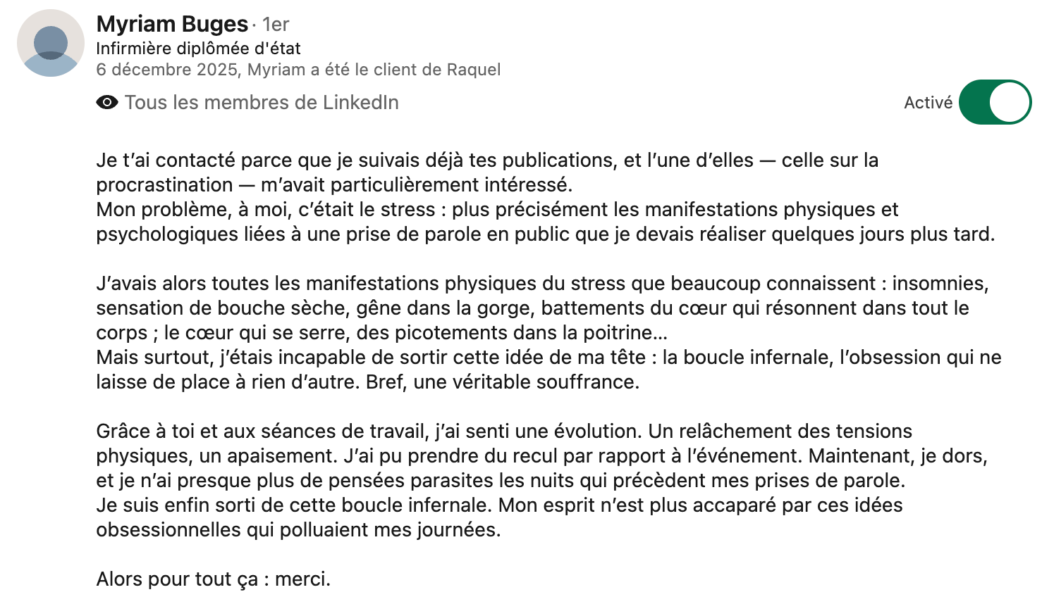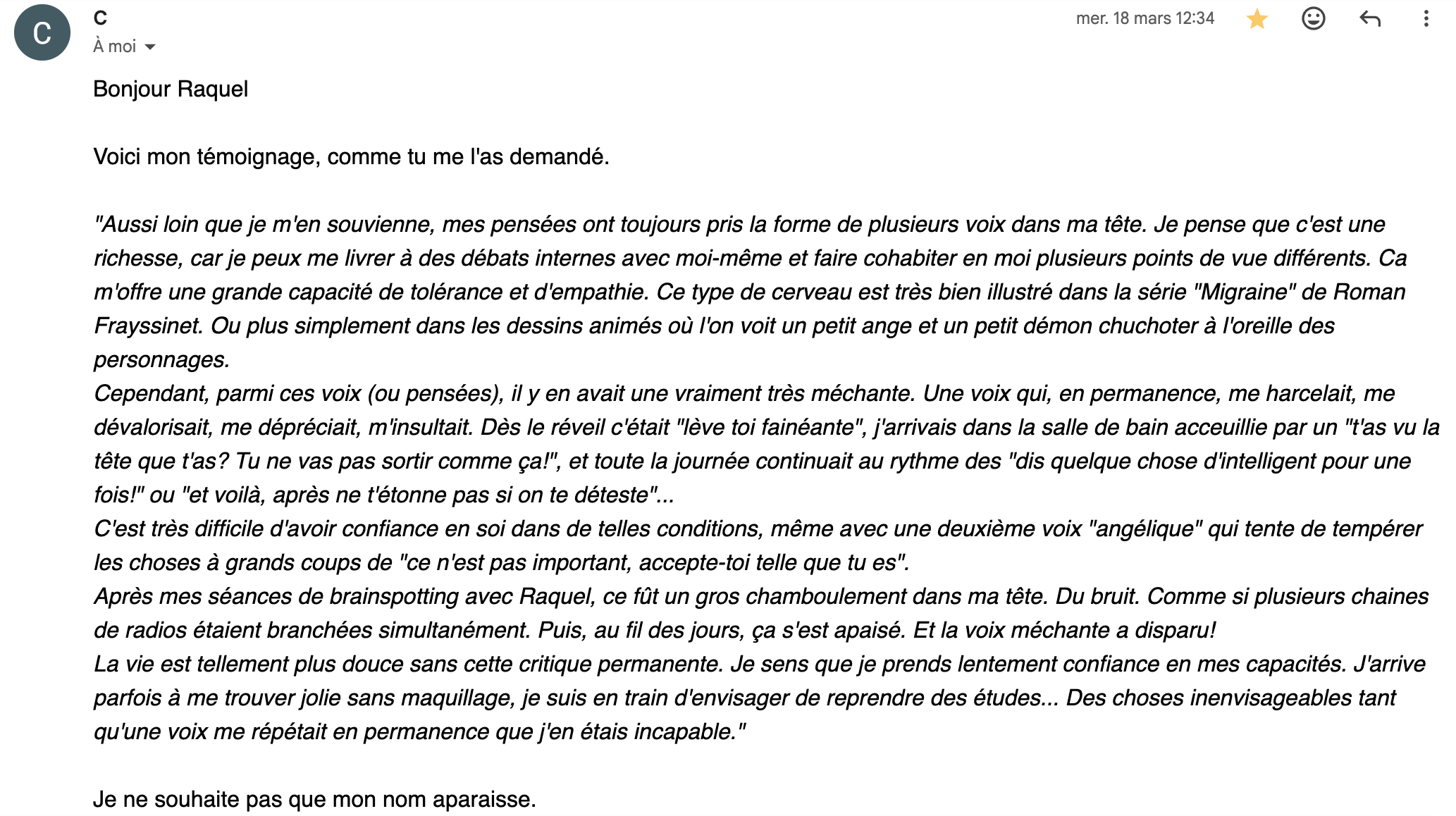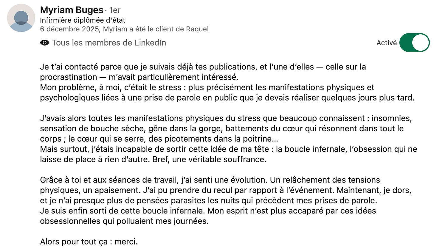 “La vie est tellement plus douce sans cette critique permanente. Je prends lentement confiance en mes capacités. Je suis en train d’envisager de reprendre des études — des choses inenvisageables tant qu’une voix me répétait que j’en étais incapable.” — Cliente anonyme